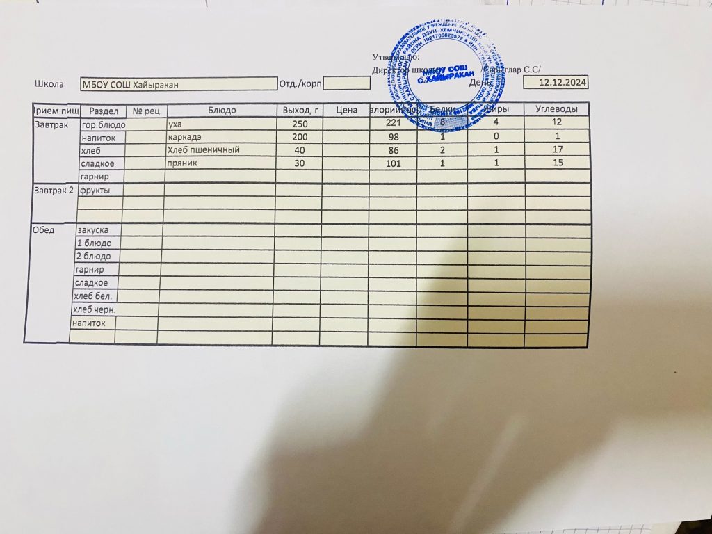Утвержденное меню на 12 декабря 2024 года.
