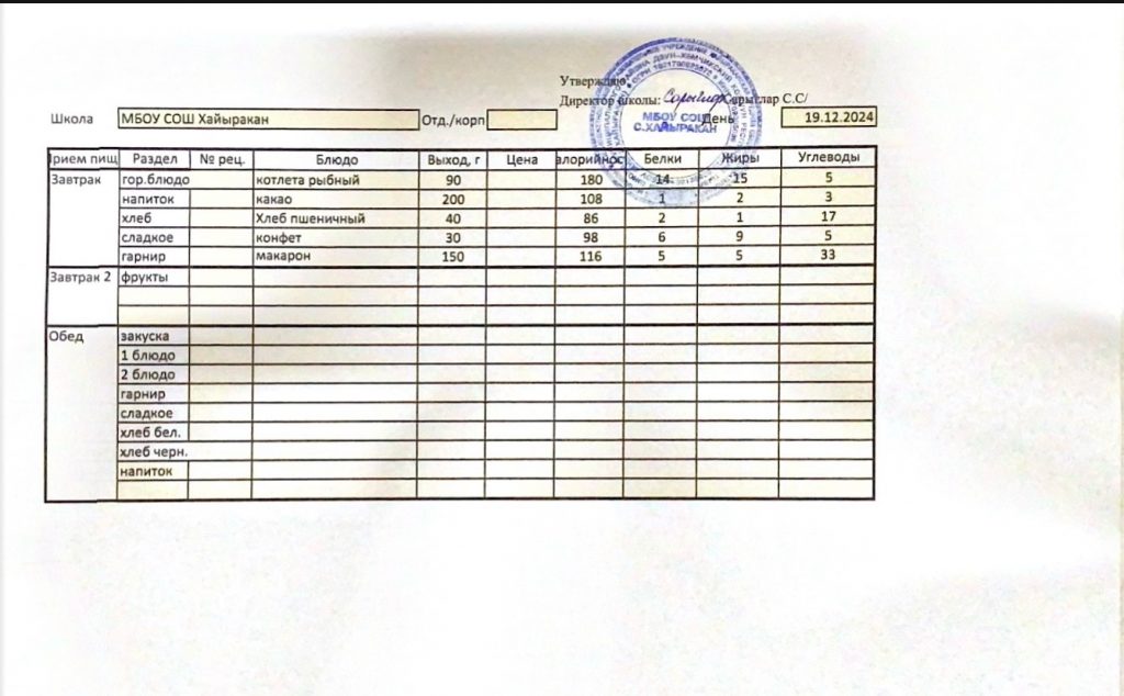 Утвержденное меню на 19 декабря 2024 года.