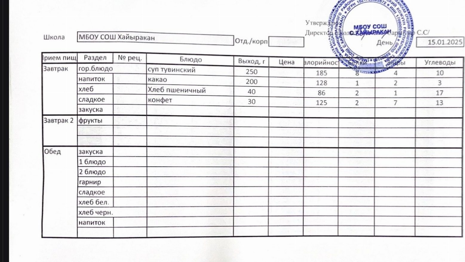 Утвержденное меню на 15 января 2025года
